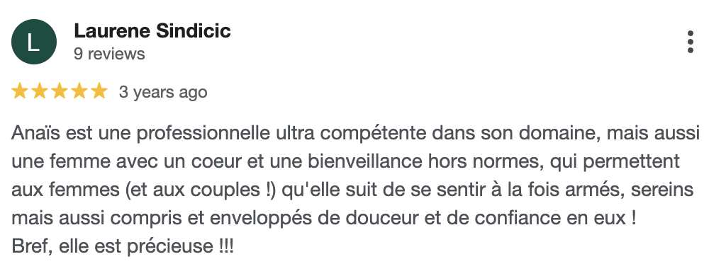 « Après trois ans d’essais infructueux pour concevoir un enfant, je me suis tournée vers Anaïs. Et quelle révélation ! Grâce à elle, j’ai découvert une toute nouvelle perspective sur mon cycle. Elle m’a aidée à mieux vivre l’attente, même dans les moments de frustration. »